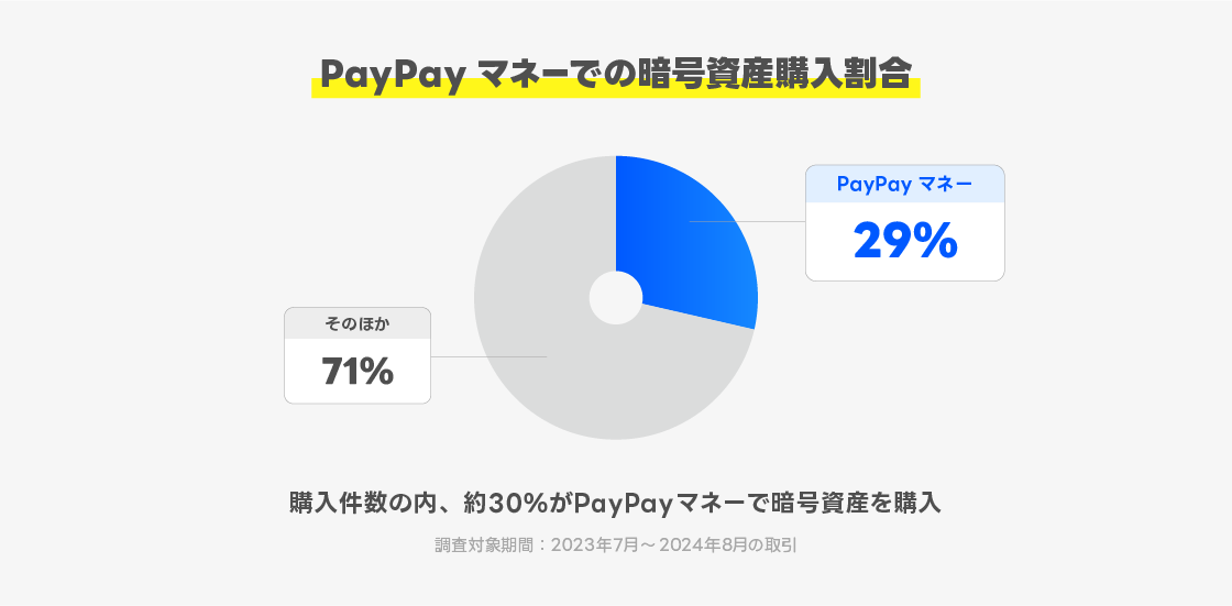 2023年7月〜2024年8月の約1年間の暗号資産購入件数のうち、約30%がPayPayマネーで暗号資産を購入しており、PayPayマネーの残高があれば、手軽に暗号資産を取引できる点がユーザーに高い人気を誇っていることがわかります。