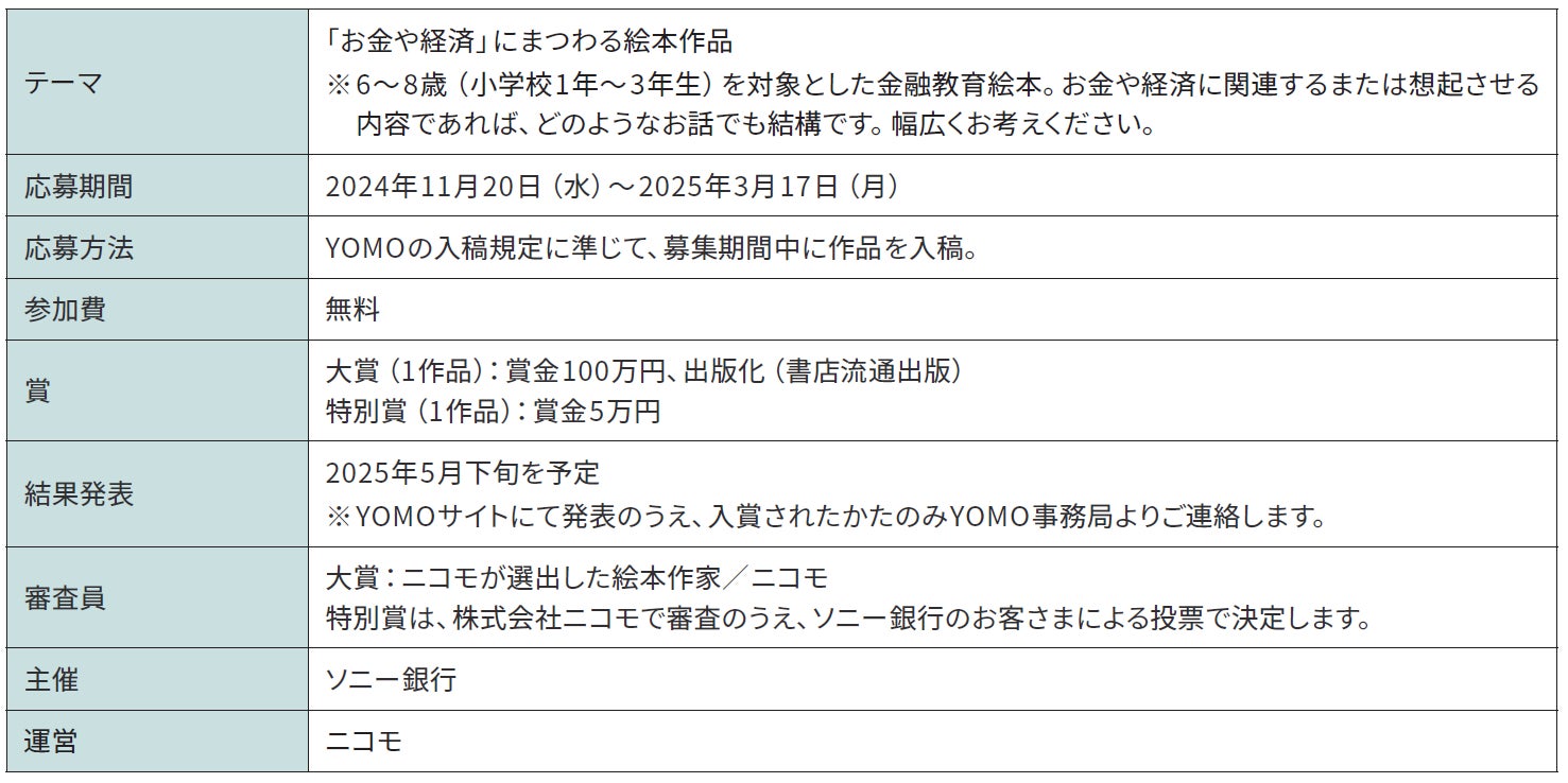 ソニー銀行株式会社(代表取締役社長:南 啓二/本社:東京都千代田区/以下 ソニー銀行)は、2024年11月20日(水)より、株式会社ニコモ(代表取締役:犬養 岬太/本社:東京都文京区/以下 ニコモ)が運営する「お金を学ぶ絵本大賞 sponsored by ソニー銀行」を開催しますので、お知らせします。