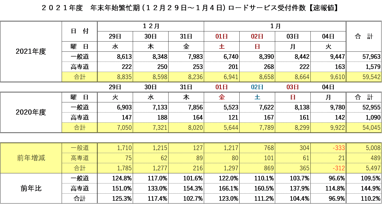 JAF(一般社団法人日本自動車連盟 会長 藤井一裕)は、年末年始期間(2021年12月29日~2022年1月4日まで)のロードサービス受付件数(速報値)をまとめました。