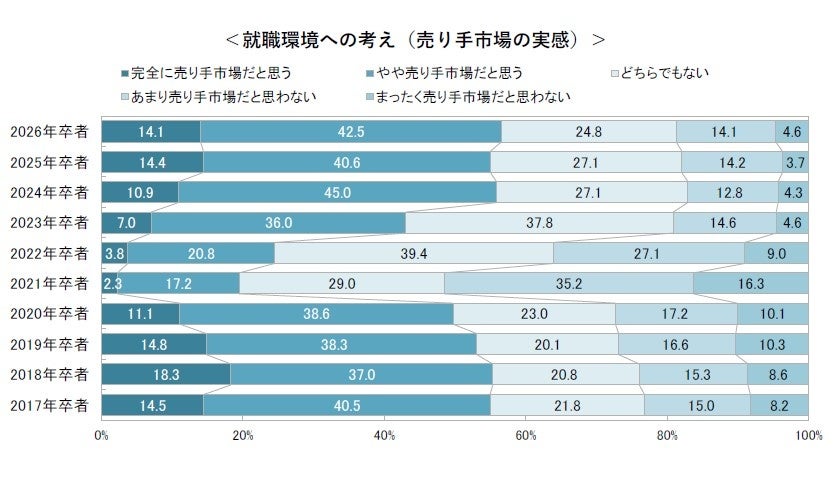 ○売り手市場だと感じる学生は全体の56.6%。3年連続で半数を超える