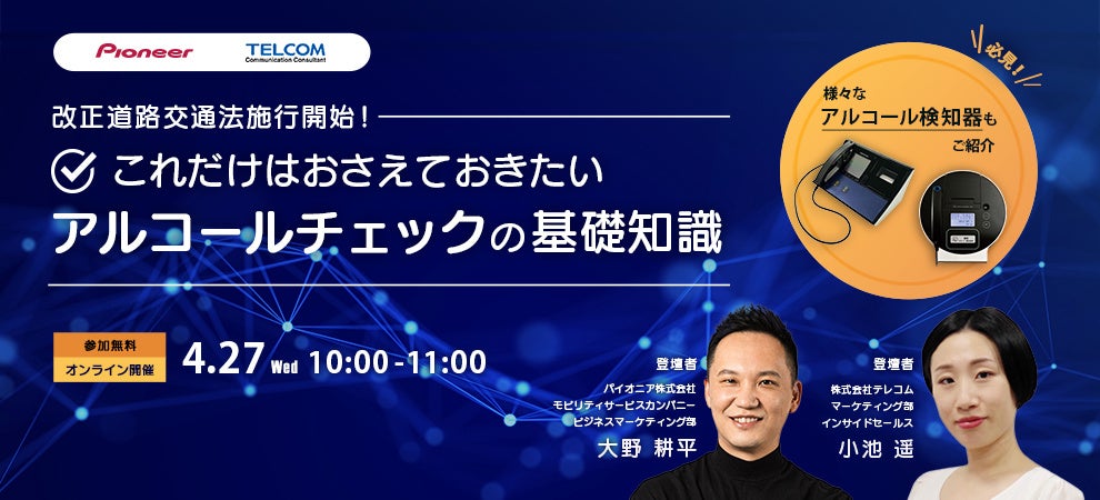 パイオニアは、企業経営者や車両管理担当者、運行データ管理担当者などを対象としたウェビナー「これだけはおさえておきたい アルコールチェックの基礎知識」を、4月27日(水)に開催します。