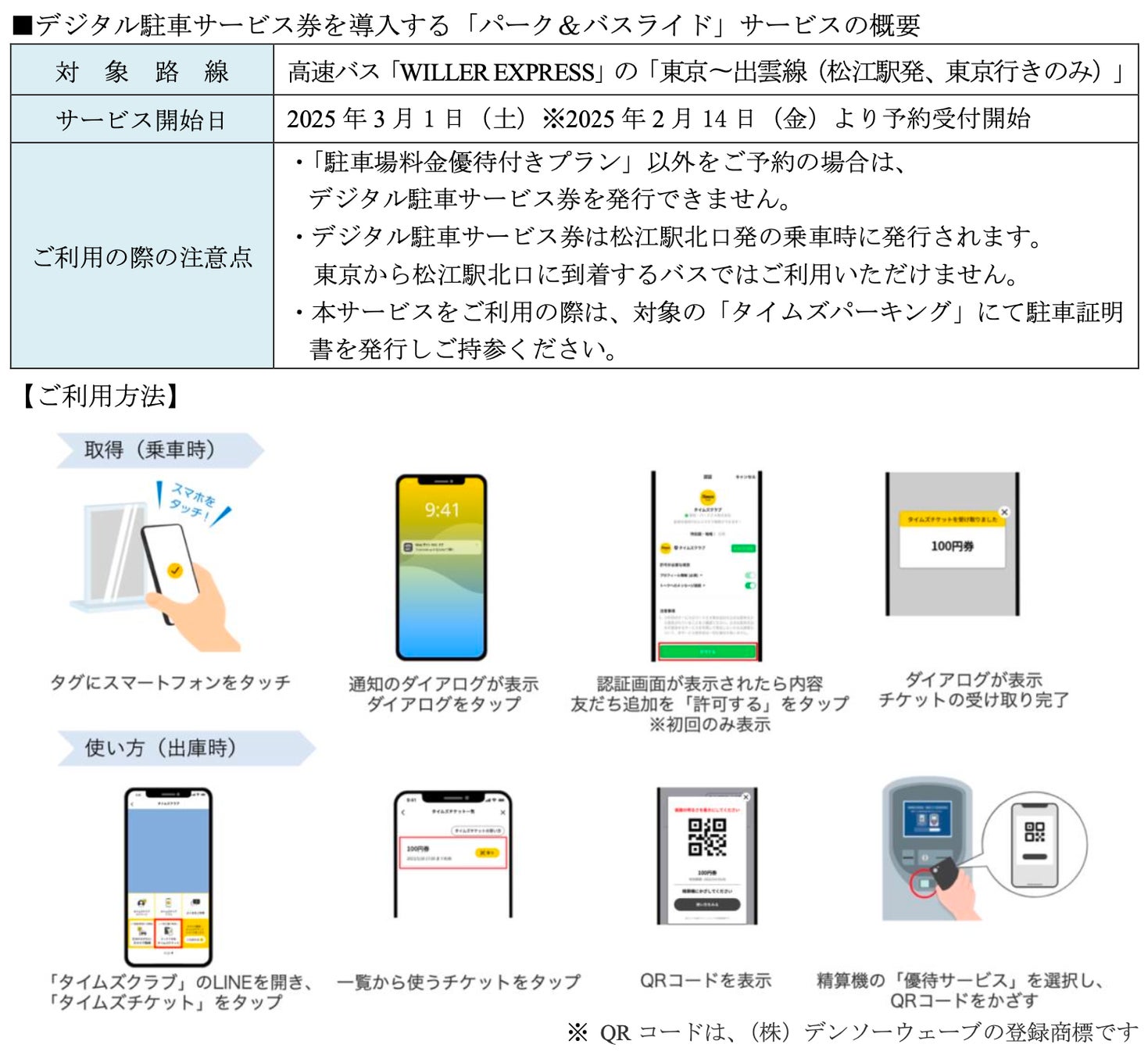本サービスは、WILLER EXPRESS 株式会社(本社:東京都江東区、代表取締役:平山幸司) が統括管理・運行する高速バス「WILLER EXPRESS」の「東京〜出雲線(駐車場料金優待付きプ ラン)」より提供を開始します。