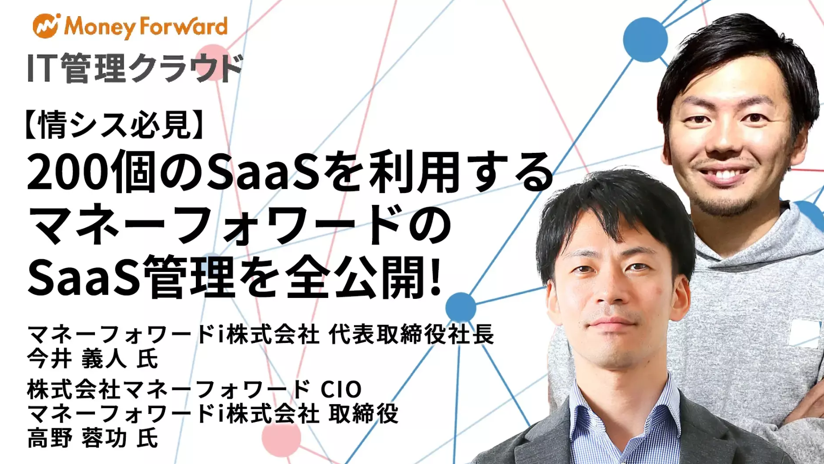 アメリカでは1社あたり110個のSaaSが利用※1されており、日本国内においてもSaaSの利用数は増加※2しています。今回の登壇では、増え続けるSaaS管理のベストプラクティスと、200以上のSaaSを利用する株式会社マネーフォワードの情報システム部門が実践しているSaaS管理方法を特別に公開いたします。