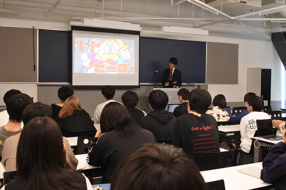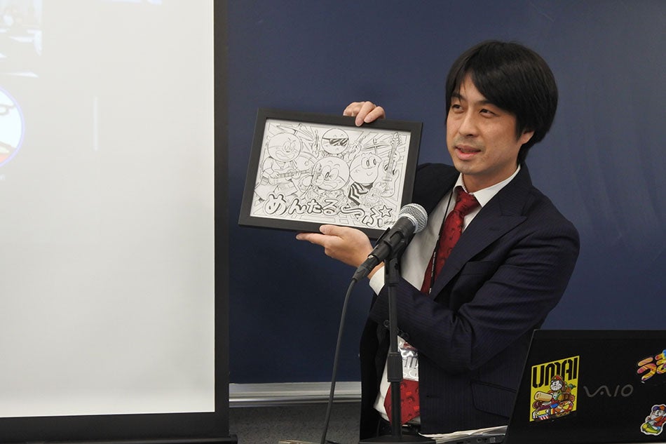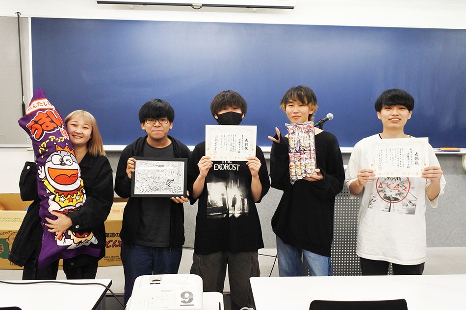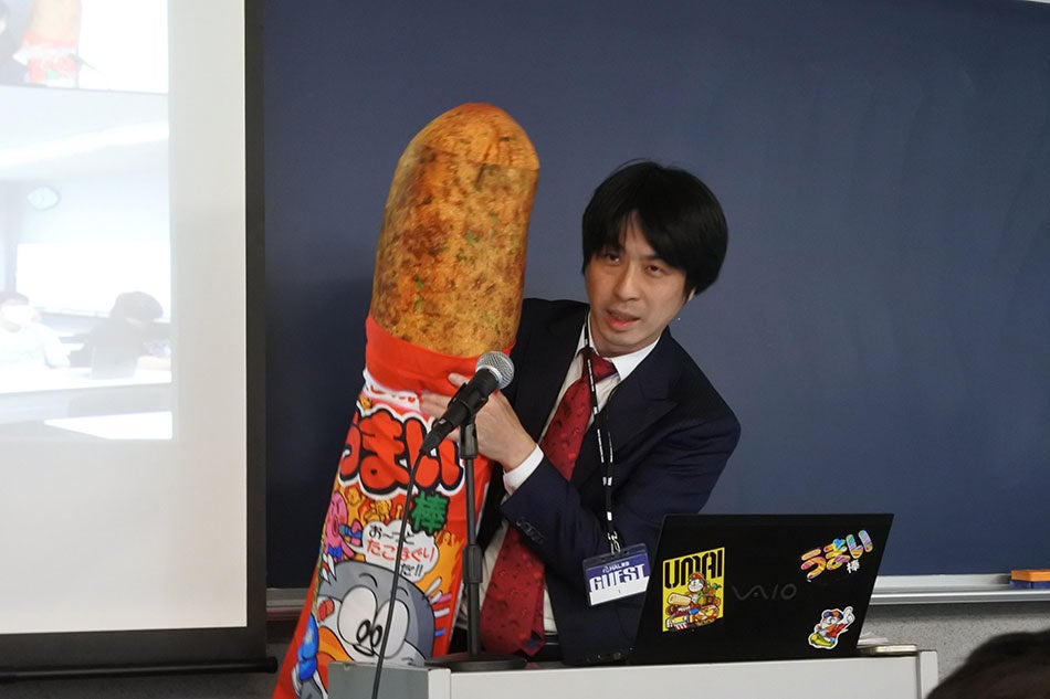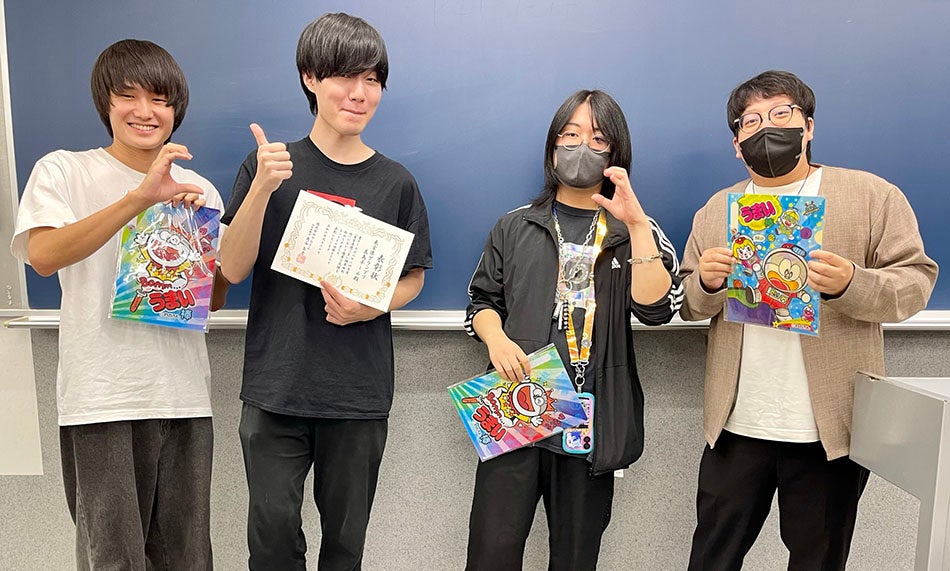 今年4月より始まったこのプロジェクト。審査を経てめんたい味など優秀作品が決定しました。副賞にはなんと、うまい棒の絵師さんがHALの学生のために描いてくれたオリジナルイラストや大きなうまい棒のクッションが贈呈され、学生もテンションがあがりました。