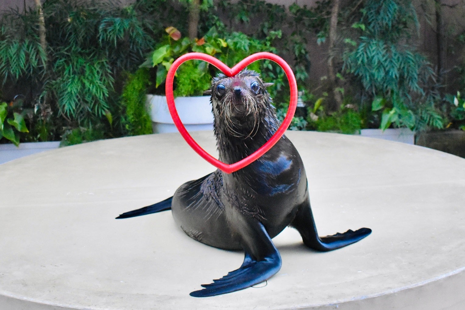 手先の器用さを活かして水槽の底からハートの石を探し、スタッフに手渡す“コツメカワウソ”。ハートに形成したごはんを嬉しそうにほおばるペンギンたち。“ゴマフアザラシ”はハートのループを使ったパフォーマンスを披露します。