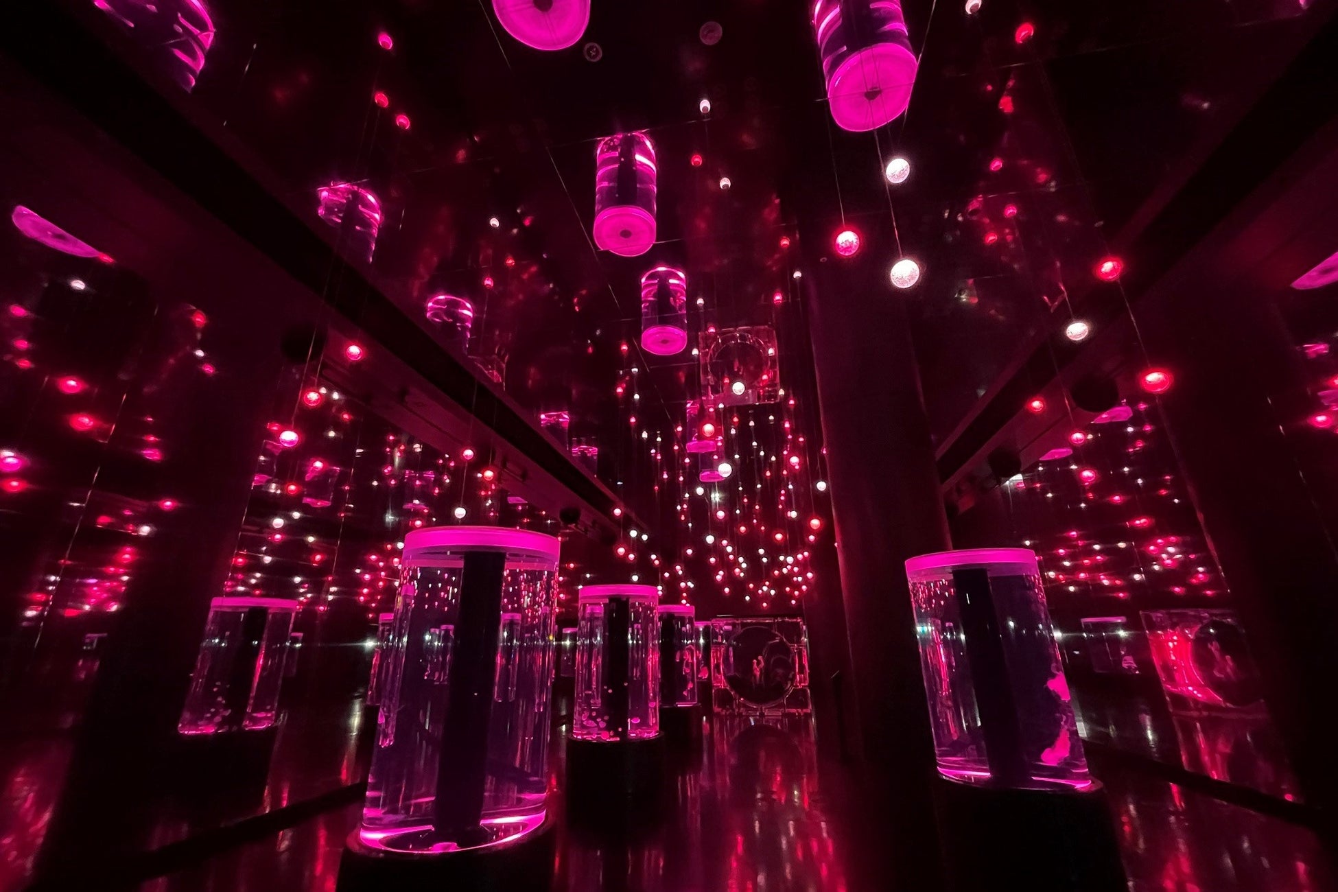 7つの円柱水槽と全面がクリスタルのシンボリックな水槽が並ぶクラゲ展示の大空間。それぞれの水槽で美しく優雅に漂うクラゲたちがご覧いただけます。
