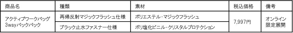 『アクティブワーク3wayバックパック』から新作登場!暗い夜道も安心の「再帰反射マジックフラッシュ」タイプと高防水素材「クリスタルプロテクション」を使用した「止水ファスナー」タイプが新発売!