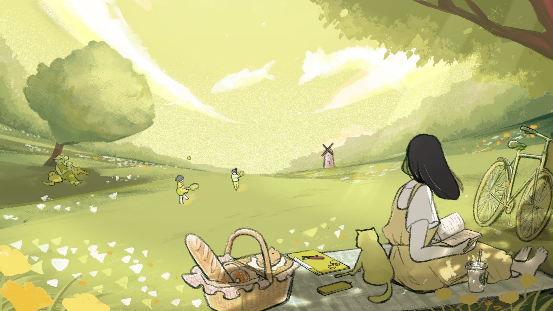 ピクニック日和の緑に覆われた公園。木陰でノートを読んでいる女の子。遠くから楽しげにリズムを刻むテニスの音が聞こえてきます。