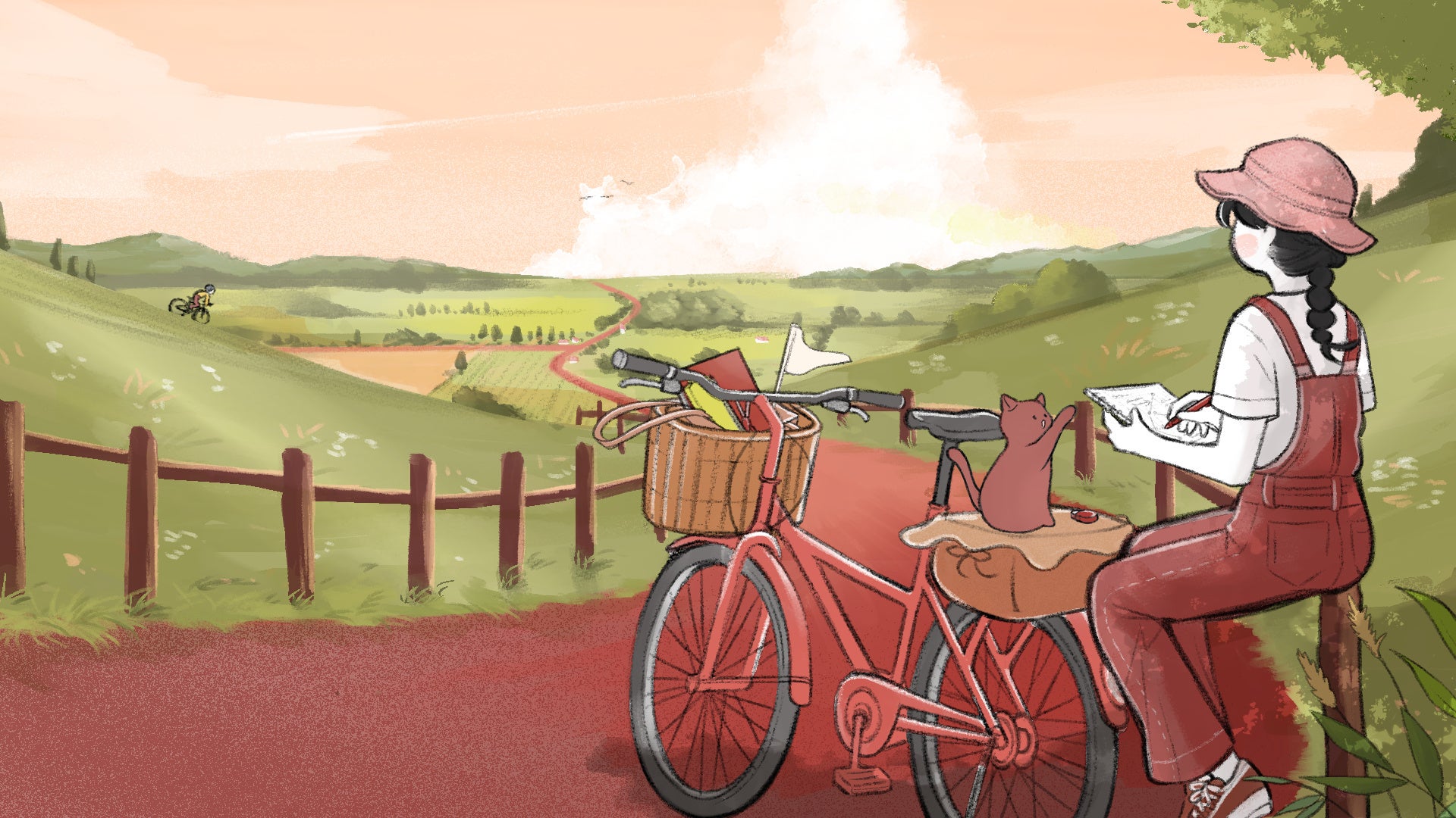 サイクリング途中、女の子が休憩がてらノートになにかメモをしています。どこまでも続きそうな草原にあるサイクリングロードです。