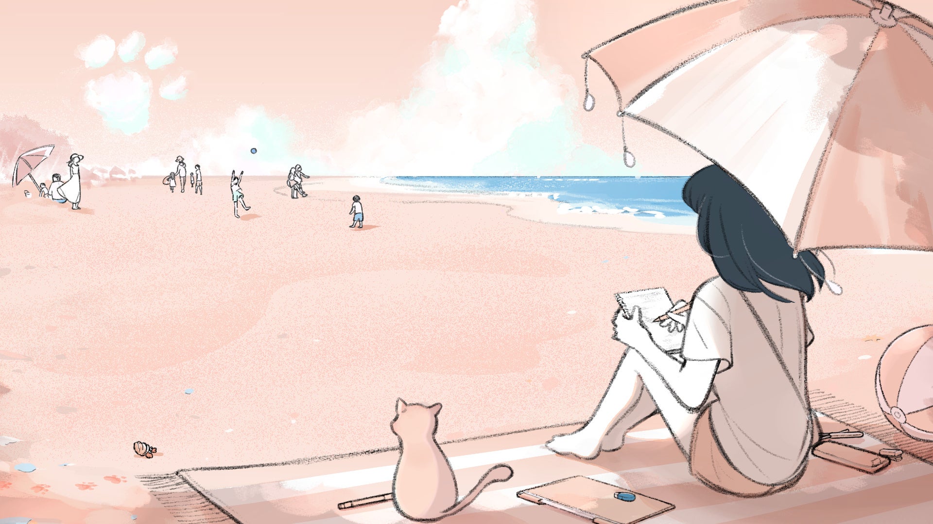 散歩日和な午後、潮風に吹かれながら砂浜で女の子がスケッチを描いています。遠くからは波打ち際の子供の楽しそうなはしゃぐ声が聞こえ、暖かい日差しと光りに包まれたビーチのシーンです。