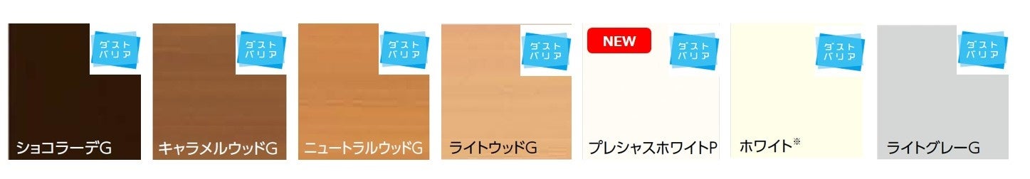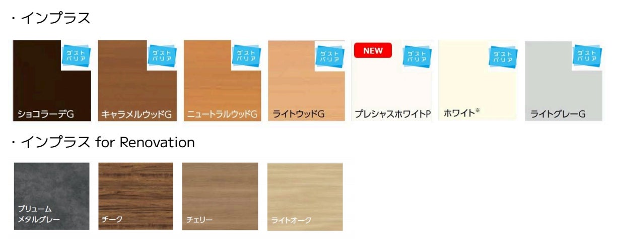 豊富な全10色のカラーラインアップのインプラス。居室仕様にプレシャスホワイトPを追加します。また、LIXILの独自技術「ダストバリア」を搭載しており、ホコリを寄せ付けにくく、汚れの目立ちやすいホワイト系のカラーでもお掃除が簡単です。