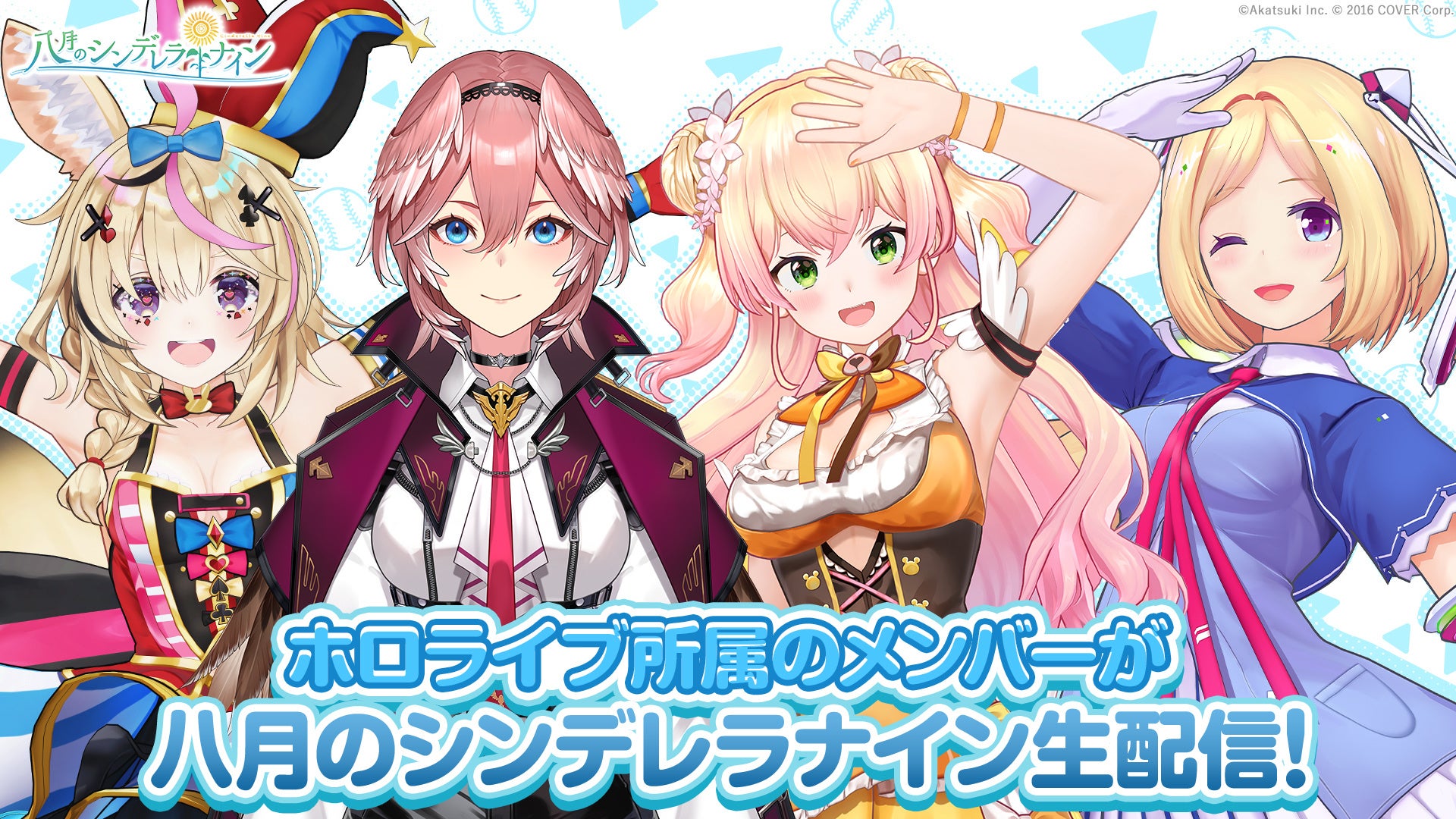 株式会社アカツキ(本社:東京都品川区、代表取締役CEO:香田哲朗、以下「アカツキ」)は、好評配信中のiOS/Android用アプリ『八月のシンデレラナイン』(略称:ハチナイ)を紹介する生配信を、ホロライブ所属の尾丸ポルカさん、鷹嶺ルイさん、桃鈴ねねさん、アキ・ローゼンタールさんが実施いたしましたことをお伝えします。