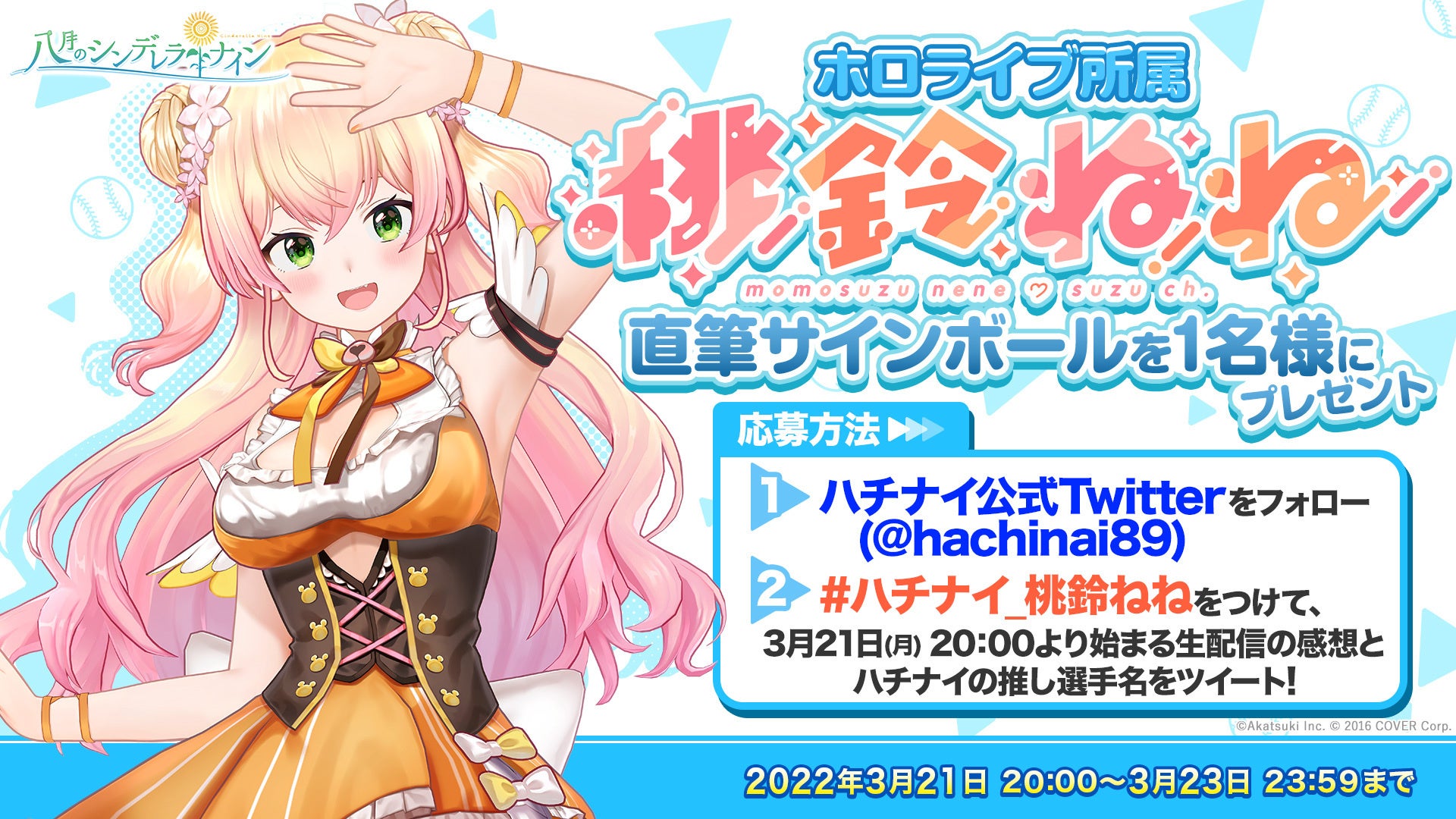 期間中、八月のシンデレラナインTwitter公式アカウント(@hachinai89 https://twitter.com/hachinai89)をフォローし、ハッシュタグ「#ハチナイ_桃鈴ねね」をつけて、3月21日 (月) 20:00より始まる生配信の感想とハチナイの推し選手名をツイートいただいた方の中から1名様に、桃鈴ねねさんの直筆サインをプレゼントいたします。