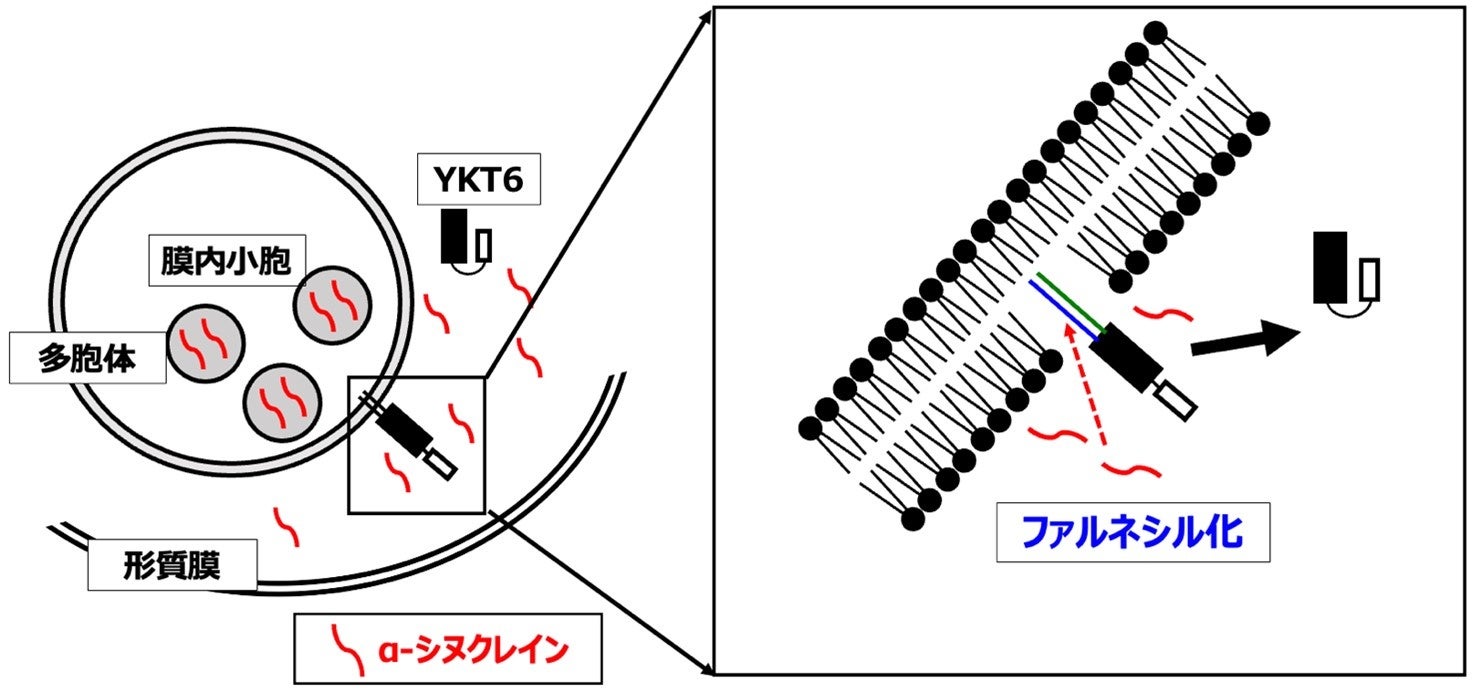 YKT6が多胞体に結合し多胞体が形質膜に癒合して多胞体内の膜内小胞を放出するが、増加したα-シヌクレインがYKT6のファルネシル化を阻害し膜結合が減少する。結果として放出されるエクソソームが減少し、細胞内にα-シヌクレインが蓄積する。