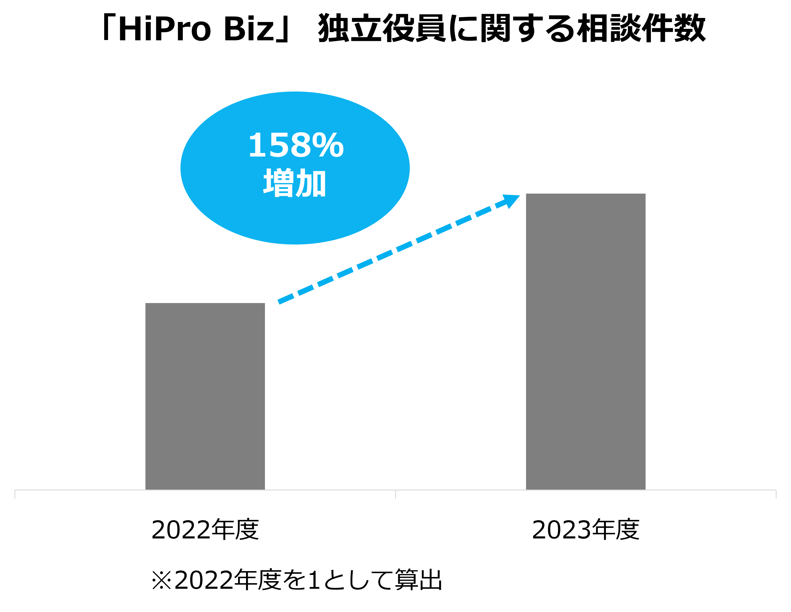 こうした状況下において、2023年度(2023年4月~2024年3月)に「HiPro Biz」に寄せられた「独立役員」の選任に関する相談件数は昨対比158%となりました。ニーズの高まりから、以前までの“人脈”中心の候補者選定では、ステークホルダーから求められるニーズを満たすことが難しくなり、多くの企業が「独立役員」の選任に苦慮していることがうかがえます。