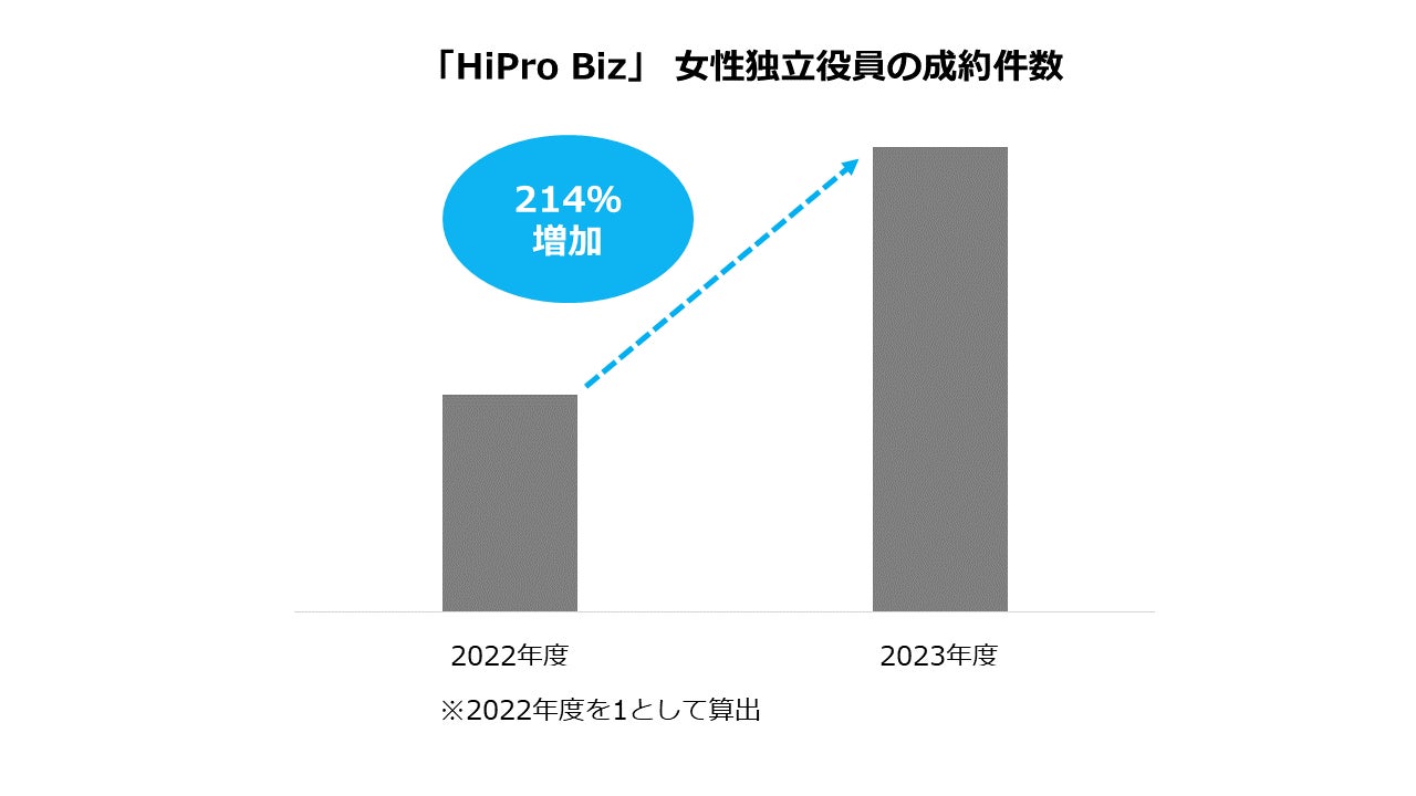 そこで、「HiPro Biz」では、企業ニーズを細かくヒアリングし、人材要件の見直しを実施。それによって、可能性を広げるとともに、独自のデータベースから、企業の状態や課題にマッチした女性独立役員候補の紹介を行っています。こうした活動により、2023年度の成約件数は、昨対比で214%にまで伸長しています。