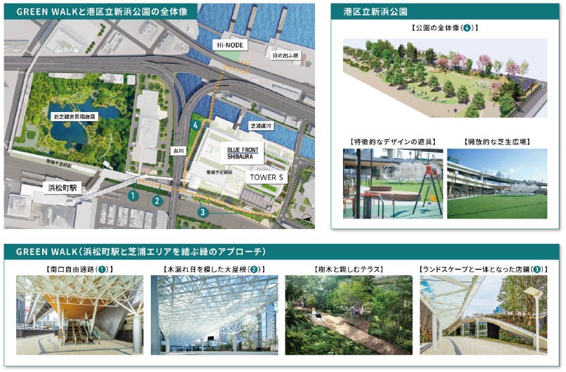 TOWER S開業に向けた第一歩として、本プロジェクトの整備の一環として取り組んでいる、JR浜松町駅から芝浦エリアをつなぐ緑のアプローチGREEN WALKも開通し、また既存の公園を集約・再整備した港区立新浜公園がオープンいたしました。また、5月30日にはGREEN WALK内エリアにて飲食店舗が先行して開業する予定です。