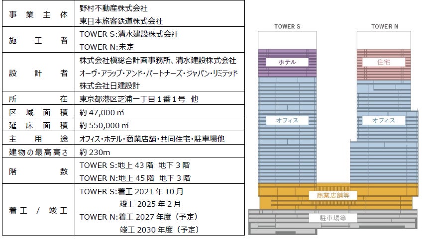 本プロジェクトは、浜松町ビルディング(東芝ビルディング:東京都港区芝浦1-1-1)の建替事業として、高さ約230mのツインタワーを建設していきます(TOWER S:2025年2月竣工済、TOWER N:2030年度竣工予定)。区域面積約4.7ha、延床面積約55万㎡の、オフィス・ホテル・商業店舗・住宅を含む、約10年間に及ぶ大規模複合開発です。この度竣工したTOWER Sにおいては、7月にラグジュアリーホテル「フェアモント東京」、8月にオフィスフロア、9月には商業店舗と順次開業を予定しております。