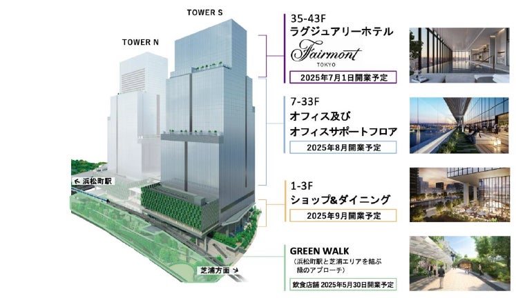 TOWER Sは主にラグジュアリーホテル、オフィス、商業店舗から構成された複合施設となります。高層階には日本初進出のフェアモントホテル「フェアモント東京」が開業、中層階には「TOKYO WORKation」をテーマに都内有数の1フロア約1,500坪のオフィス専有部と自然環境を活かした共用部からなるオフィスフロア、低層階及び外構部には「地域のHUB」となる2つのフードホールを中心に約 40 店舗の商業店舗を展開いたします。TOWER Sは下記のとおり、順次開業を予定しております。