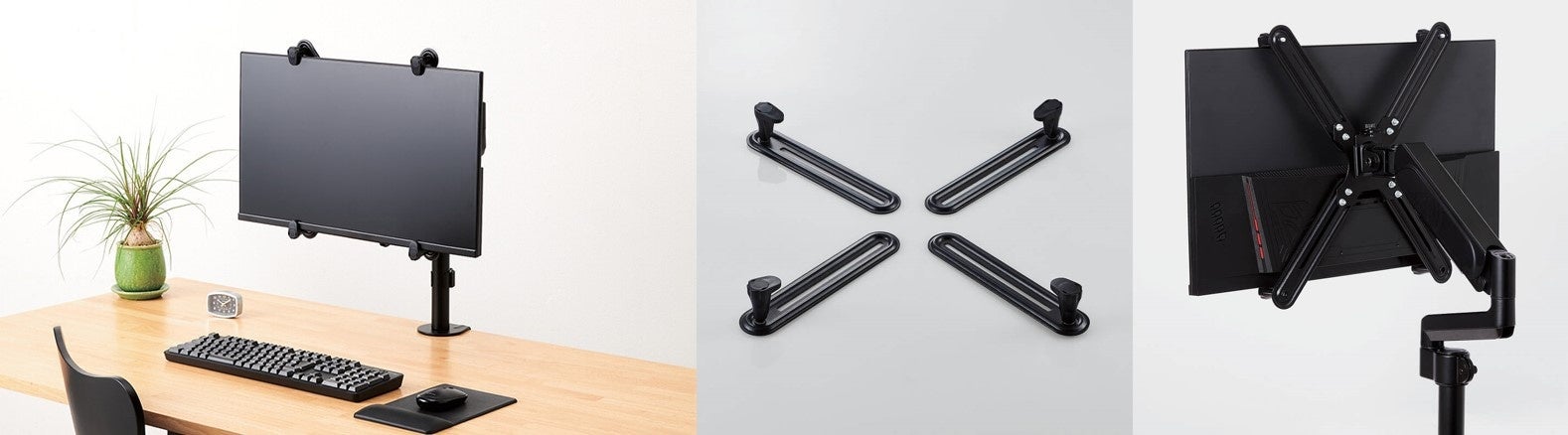 本製品をVESA規格のネジ穴がないモニターに装着することで、VESA規格対応のモニターアームに取り付けできるようになります。これによりモニターの位置調整がしやすくなり、快適な操作環境を実現します。VESA規格に対応する各種アクセサリーにマウント可能です。