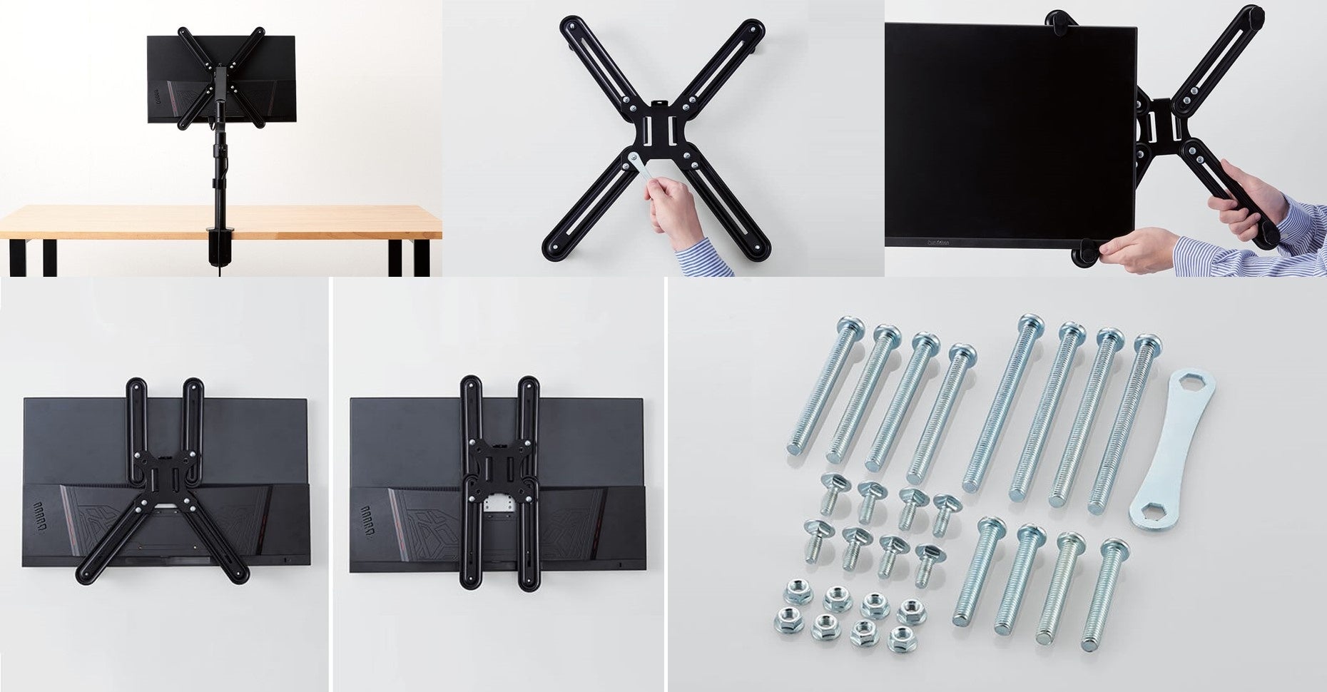 4つのアームシステムで、様々な形状のモニターに合わせて調節し、固定します。26.5~60mmの厚さのほとんどのモニターに対応します。
