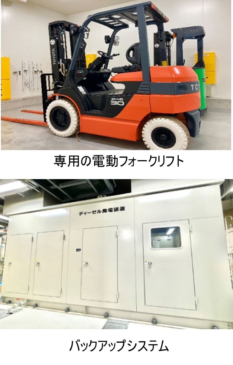 ■温度管理機能+2℃~+8℃および+15℃~+25℃で温度設定された冷蔵室、定温室を有するほか、庫内の温度変化を抑えるため、搬出入時の空気流出入を緩衝する前室、防熱扉、高速シートシャッター、エアカーテンを完備しています。また、庫内環境は温度監視システムにより、常時モニタリングされています。そのほか、充電式定温コンテナを複数台同時に再充電することが可能です。