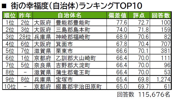 1位は、京都府と兵庫県の間に位置し、箕面市と茨木市に隣接している大阪府豊能郡豊能町です。2位は大阪府三島郡島本町で、「住み続けたい街(自治体)」1位、「街に誇りがある(自治体)」4位、「街に愛着がある(自治体)」5位となっている町です。3位は姫路市に隣接している兵庫県神崎郡福崎町で、昨年28位から大きく順位を上げています。