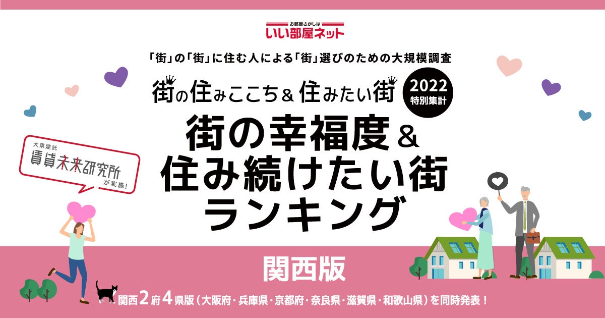 大東建託株式会社(本社:東京都港区、代表取締役社長:小林克満)は、過去最大級の居住満足度調査を行い、「いい部屋ネット 街の幸福度ランキング2022<関西版>」「いい部屋ネット 住み続けたい街ランキング2022<関西版>」として集計しました。