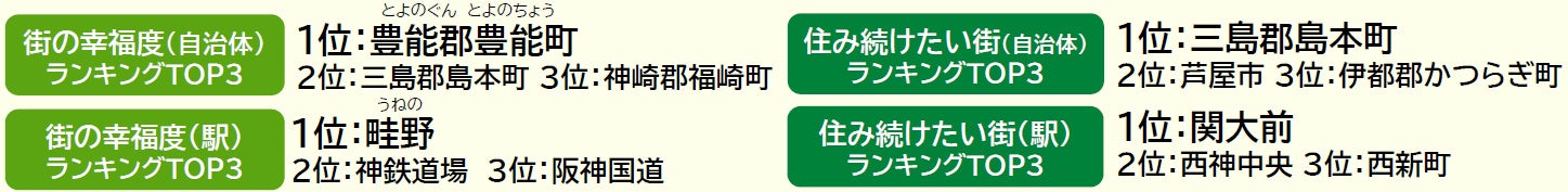•「街の幸福度(駅)ランキング」「住み続けたい街(駅)ランキング」は、駅徒歩15分以内に居住している回答者が30名以上の駅を、「街の幸福度(自治体)ランキング」「住み続けたい街(自治体)ランキング」は、回答者50名以上の自治体を対象として集計しています。