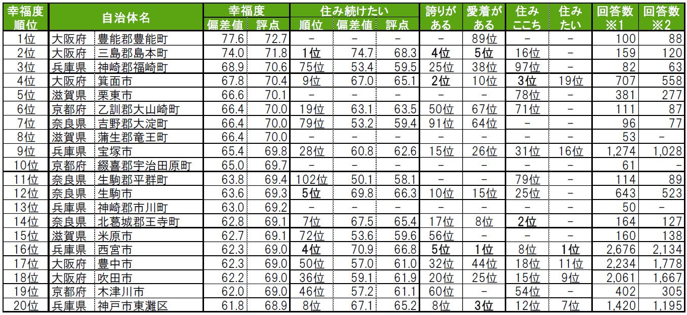 •「回答数※1」は、街の幸福度ランキングの設問に回答した2019年~2022年の4年間の累計回答数、「回答数※2」は、住み続けたい街・誇りがある街・愛着がある街ランキングの設問に回答した2020年~2022年の3年間の累計回答数です。