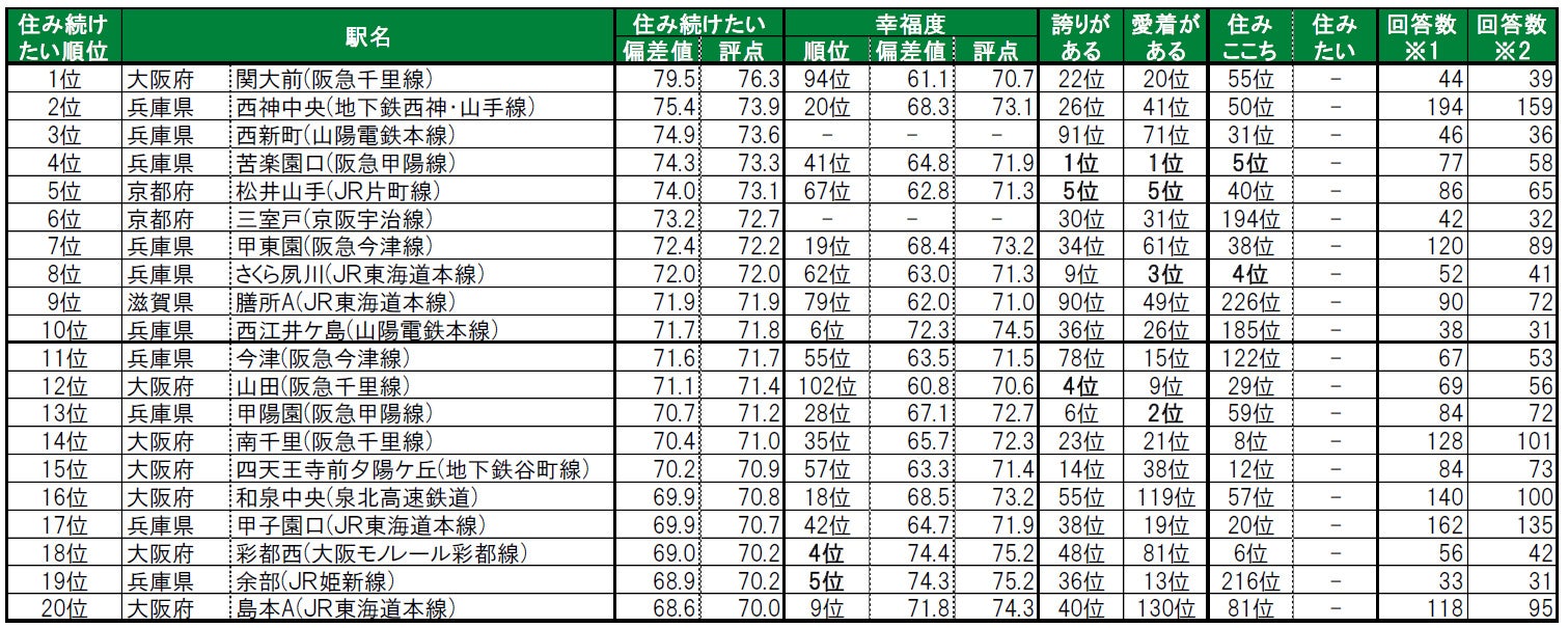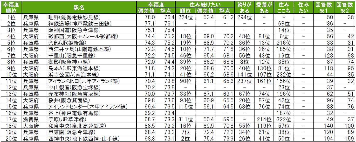 1位は関大前で、昨年は累計回答数が30名未満だったためランキング集計対象外だった大阪府吹田市にある駅です。2位は神戸市西区にある西神中央で、「街の幸福度(駅)」では20位となっています。3位は西新町で、昨年は累計回答数が30名未満だったためランキング集計対象外だった兵庫県明石市にある駅です。