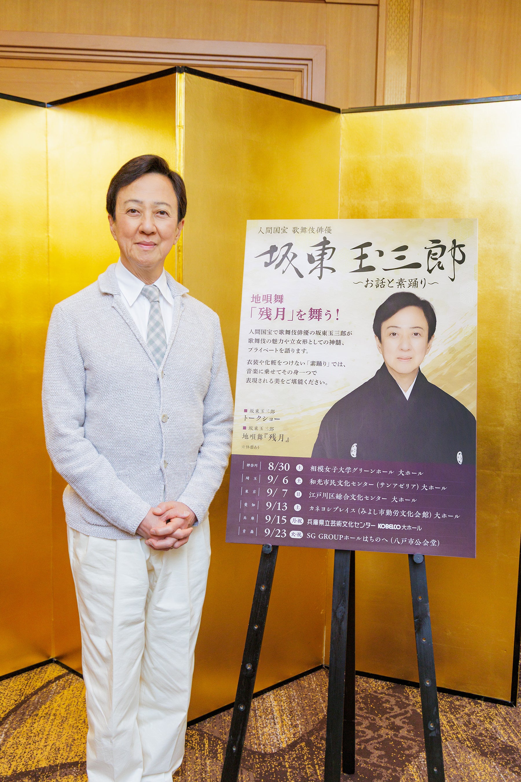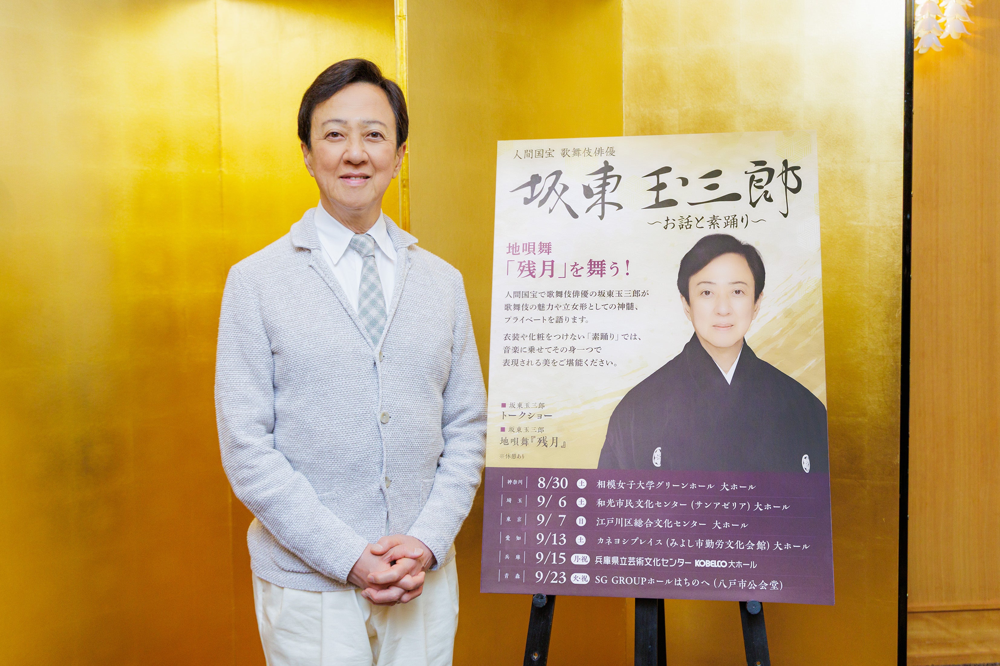 『坂東玉三郎~お話と素踊り~』は、2021年7月にスタートした。コロナ禍の時期でありながら満席の観客に好評を得、これまで全国各地を巡り回数を重ねてきた人気の公演だ。今年は3月に6か所の公演を終え、8月末から9月にかけて6都市を巡演する。今回も、事前に観客から募集した質問に答えつつ、歌舞伎の魅力や立女形の神髄、プライベートまで映像を交えて語るトークコーナーと、地唄舞『残月』を素顔のままで舞う“素踊り”という構成。歌舞伎の劇場では見ることのできない、玉三郎の芸と生の素顔に出会える希少な機会を、身近なホールで楽しむことができる。京都・南座で『坂東玉三郎 特別公演』の公演中に合同取材会を開催、玉三郎が公演への思いを語った。