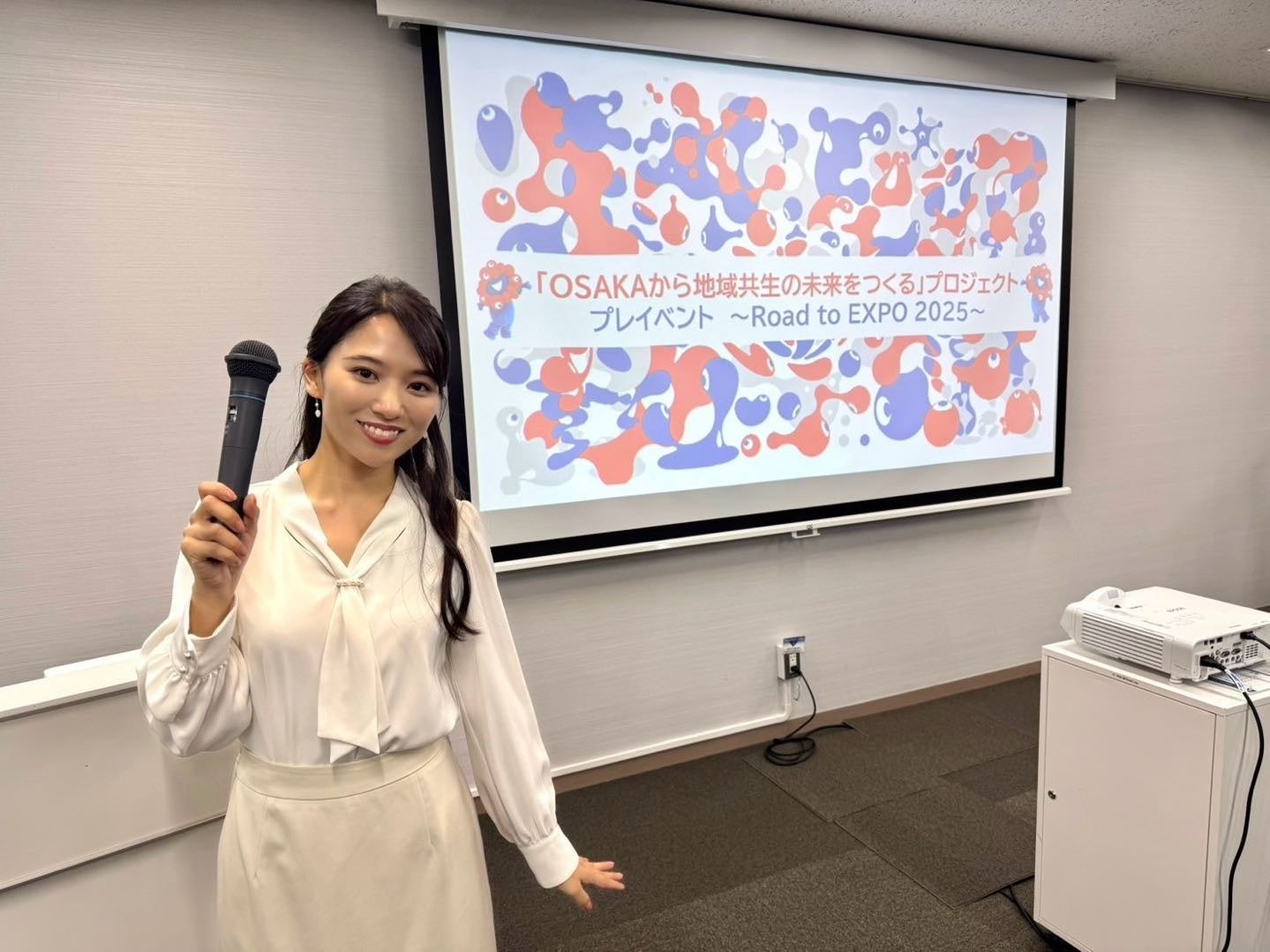 吉村 洋文 知事からの開会挨拶でスタートしたイベントでは、株式会社ノーサイド 代表取締役 中西 良介様の登壇と、同社ノーサイド横沼に所属するアーティスト 早川ひかる様が「2050年の大阪がこうなったらいいな」をテーマに、万博会場での展示をめざして今後制作する絵画についてのコンセプトや思いの発表がありました。