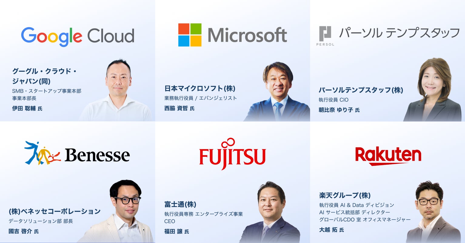グーグル・クラウド・ジャパン合同会社、日本マイクロソフト株式会社、富士通株式会社、パーソルテンプスタッフ株式会社、楽天グループ株式会社、株式会社ベネッセコーポレーションなど、DX推進やAI活用の最前線で活躍する企業が登壇し、実践的な事例や活用ノウハウを紹介します。