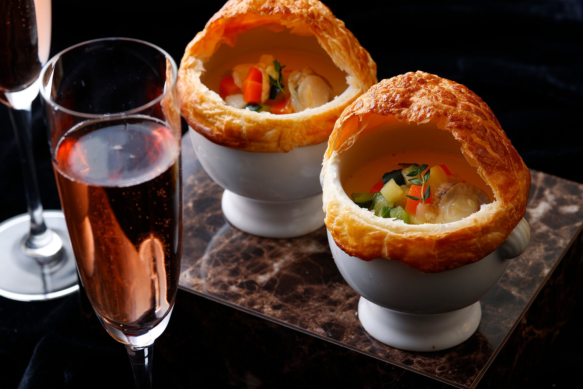 ブッフェの始まりにはおもてなしの一品としてクラムチャウダー風のパイ包み焼きスープをお席までお持ちいたします。