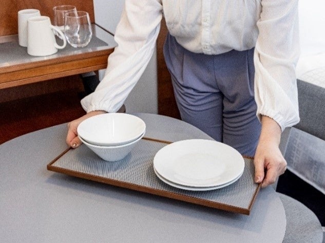 新たな客室「シアター・ダイニング」では、客室内での食事のしやすさも追求しつつ、リラックスできる場として、また仕事をしたり 1 日の予定を立てたりする場として、お客様一人ひとりの過ごし方に寄り添い、テーブルをステージへと見立て、自分だけのストーリーが生まれるような空間作りを実現しています。