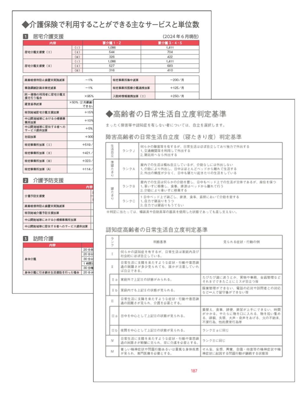 ダイアリー巻末にはすぐに確認したい、訪問先や会議で使う資料を厳選して掲載!利用者・家族、医療従事者等との会話の場面でも活用できます!