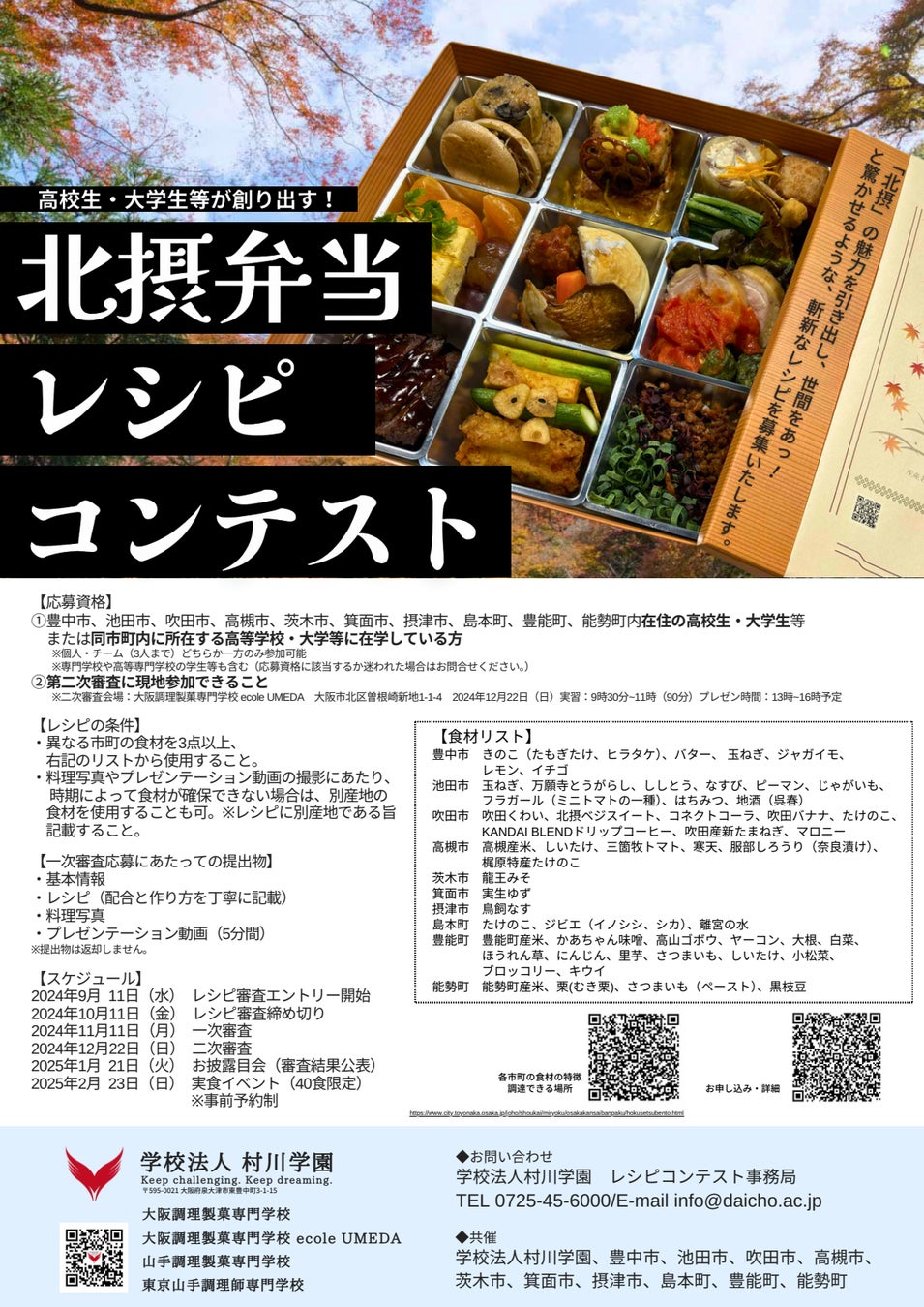 北摂自治体(豊中市、池田市、吹田市、高槻市、茨木市、箕面市、摂津市、島本町、豊能町、能勢町)と学校法人村川学園は、2025年大阪・関西万博を契機に大阪府を訪れる人々へ北摂エリアを一体的にプロモーションするため、「北摂弁当」を制作します。この「北摂弁当」は、北摂の食材を組み合わせたレシピを募集し、弁当の内容を決定します。