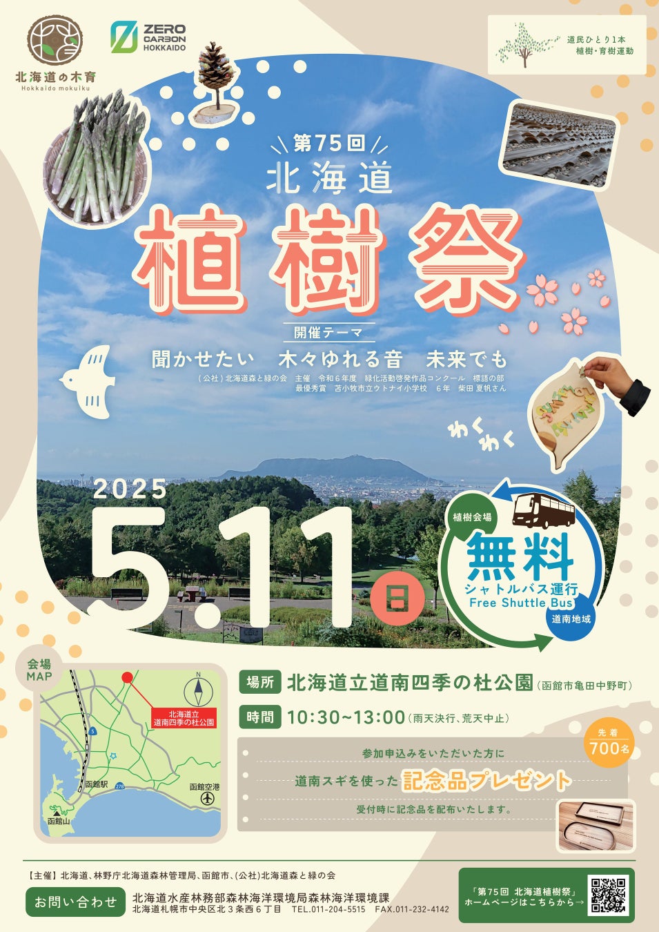 令和7年5月11日(日)に函館市「北海道立道南四季の杜公園」で開催する「第75回北海道植樹祭」の参加者を募集します。