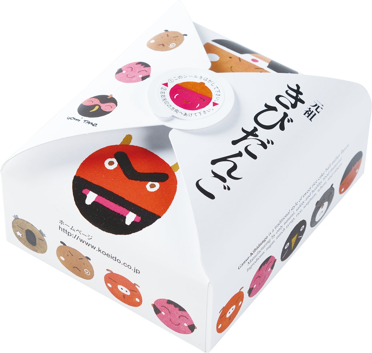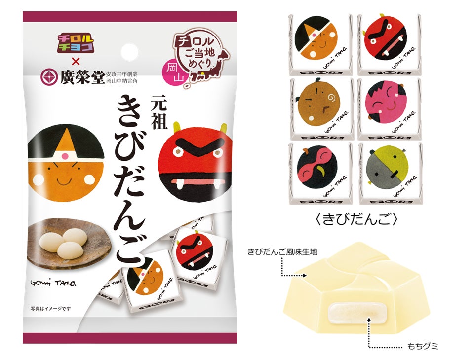 優しい甘味のきびだんご風味生地の中にもちグミを組み合わせました。素材の旨味が生きた素朴な味わいある廣榮堂のきびだんごを忠実に再現♪絵本作家の五味太郎氏のイラストデザインを忠実にチロルチョコのパッケージに落とし込みました。
