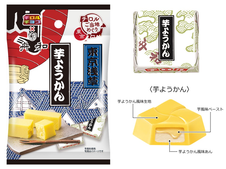芋ようかん風味生地の中に芋風味ペーストと芋ようかん風味あんを閉じ込めました。舟和の「芋ようかん」が持つ素朴なほくほくとした芋の美味しさを忠実に再現!個包装には舟和の包装紙のデザインを落とし込みました♪