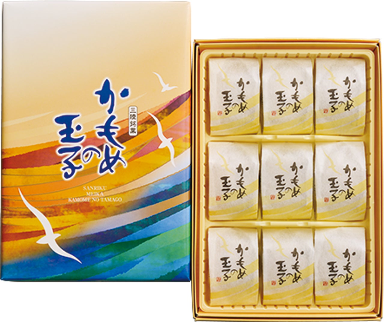 ホワイトチョコの中に黄味餡風ソースと黄味餡を閉じ込め、見た目も味もそっくりに仕立てています♪青い海原の上を飛ぶカモメの姿を見て考えられたお菓子“かもめの玉子”のデザインを忠実にパッケージに落とし込みました。