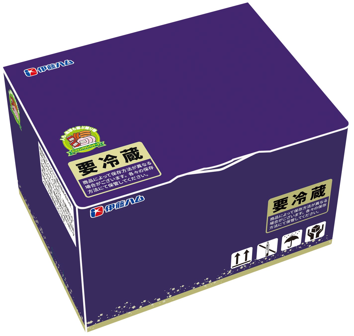 ギフトに使用する箱は、環境に配慮した箱の使用商品を拡大します。昨年歳暮期に導入した冷凍ギフト向けの「エココンパクトパッケージ」を冷蔵温度帯のハムソーセージギフトにも使用範囲を拡大します。リサイクル率が高いダンボールを使用し、また既存箱と比べ使用部材を減らすことで箱重量も削減しています。商品を箱に入れる際に、縦に重ねることでコンパクトに収めることができ、輸送時やお客様が冷蔵庫で保管される際も空間を取らずに済みます。また、箱には環境に配慮したものであることが伝わるように、「人も、地球も喜ぶ贈り物 エココンパクトパッケージ」いうロゴマークを作成し、印刷しています。