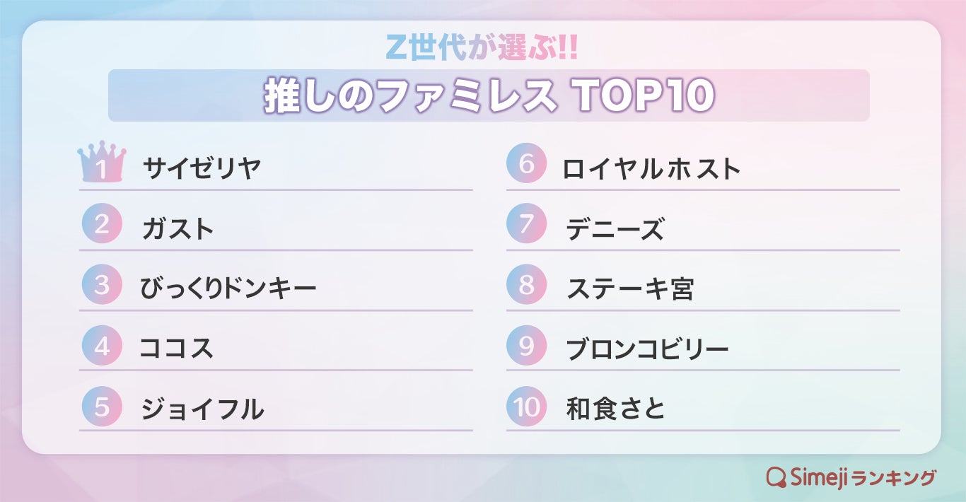 【Simejiランキング】Z世代が選ぶ!!「推しのファミレスTOP10」