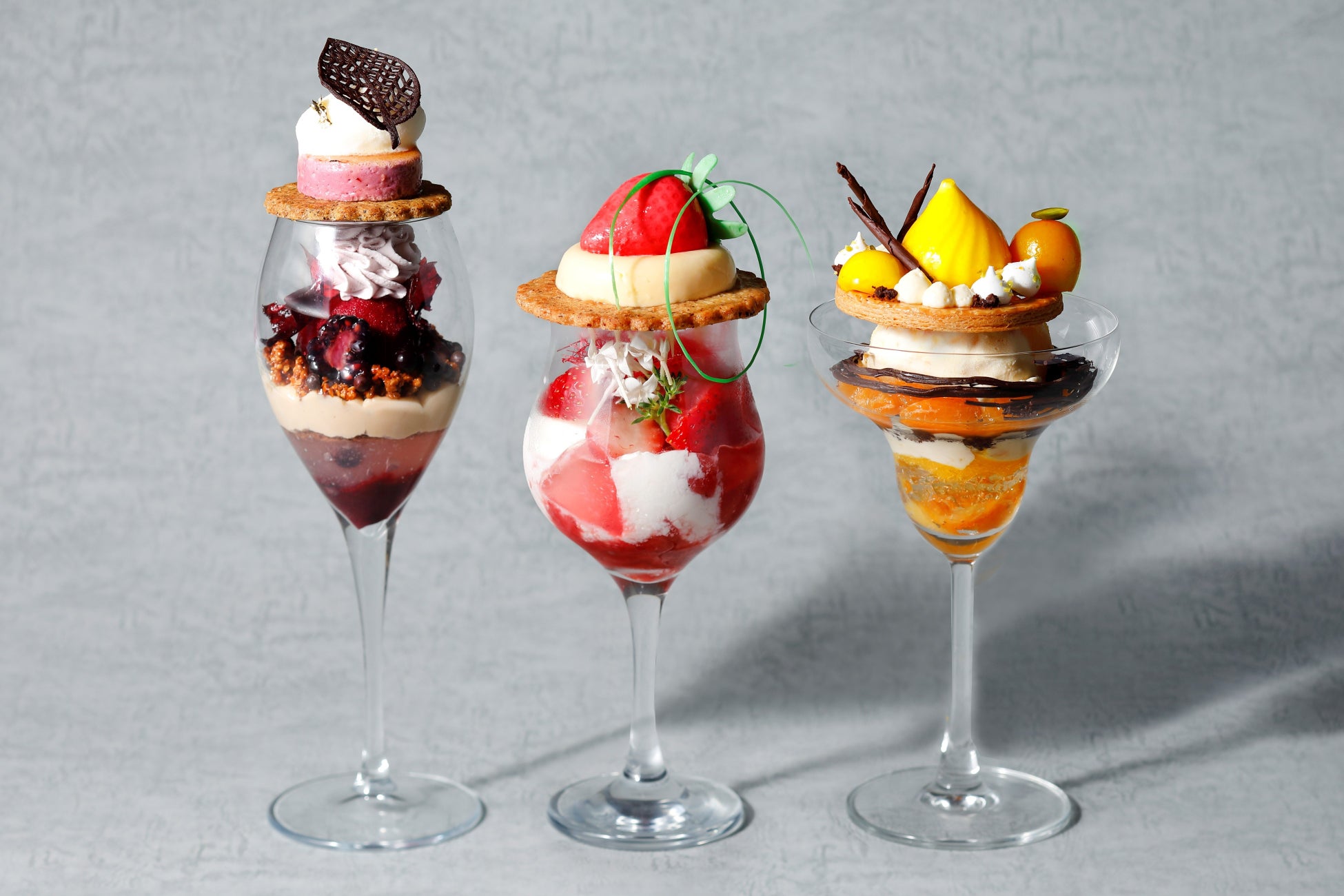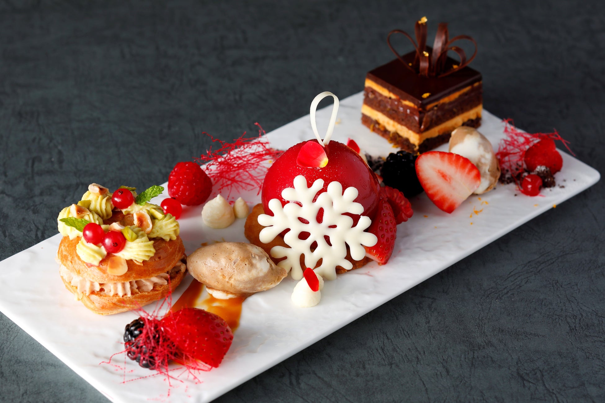 3種のデザートはさまざまな味わいをお楽しみいただけるよう、ナッツ、ベリー、チョコレートを主役にそれぞれ仕立てました。