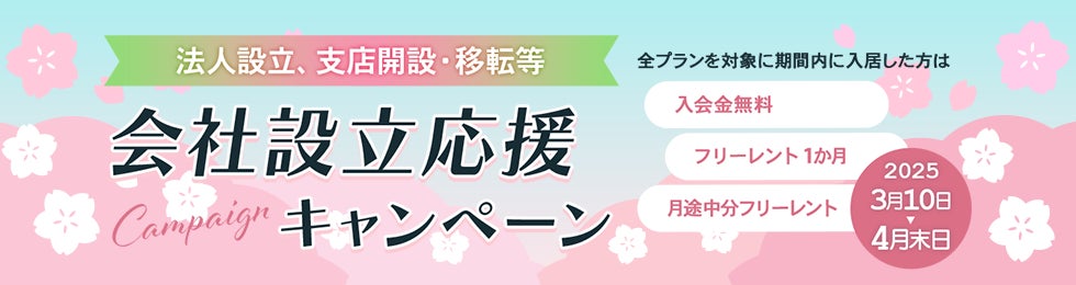 ・対象:法人設立予定または拠点開設、移転予定の方で「レンタルオフィスプラン(個室)」「シェアオフィスプラン」「バーチャルオフィスプラン」をご契約のお客様