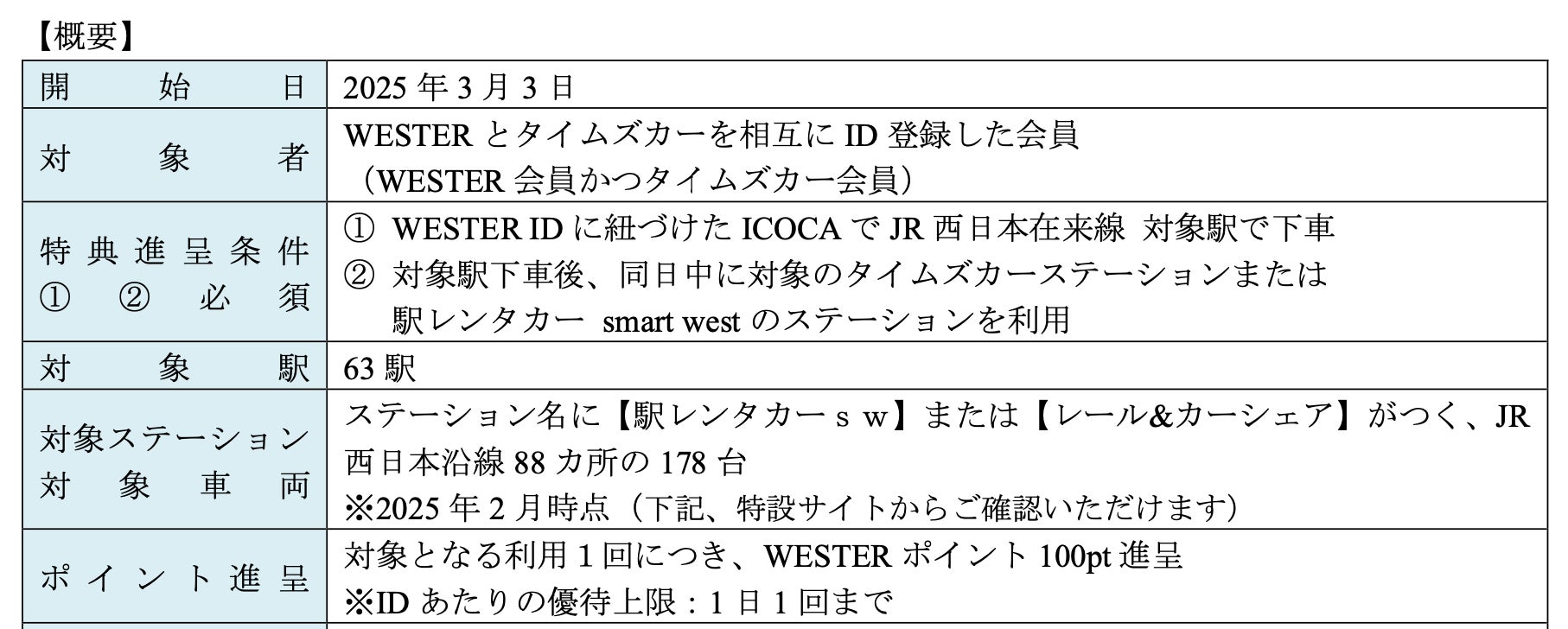 西日本旅客鉄道株式会社(本社:大阪府大阪市、社長:長谷川一明、以下「JR 西日本」)と JR 西日本レンタカー&リース株式会社(本社:兵庫県尼崎市、社長:岡田学)および タイムズモビリティ株式会社(本社:東京都品川区、社長:川上紀文、以下「タイムズモビリティ」) は、2025 年 3 月 3 日(月)より、JR 西日本の在来線と「駅レンタカー smart west」またはカーシェ アリングサービス「タイムズカー」を組合せて移動すると「WESTER ポイント※」がもらえる優待サービスを開始いたします。