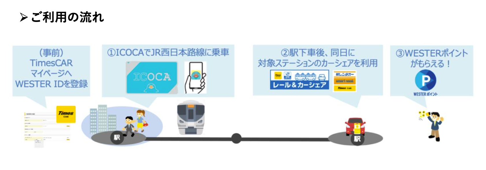 タイムズカー×JR 西日本グループ JR 西日本の在来線とカーシェアを組合せて移動すると「WESTER ポイント」がもらえる優待サービス開始