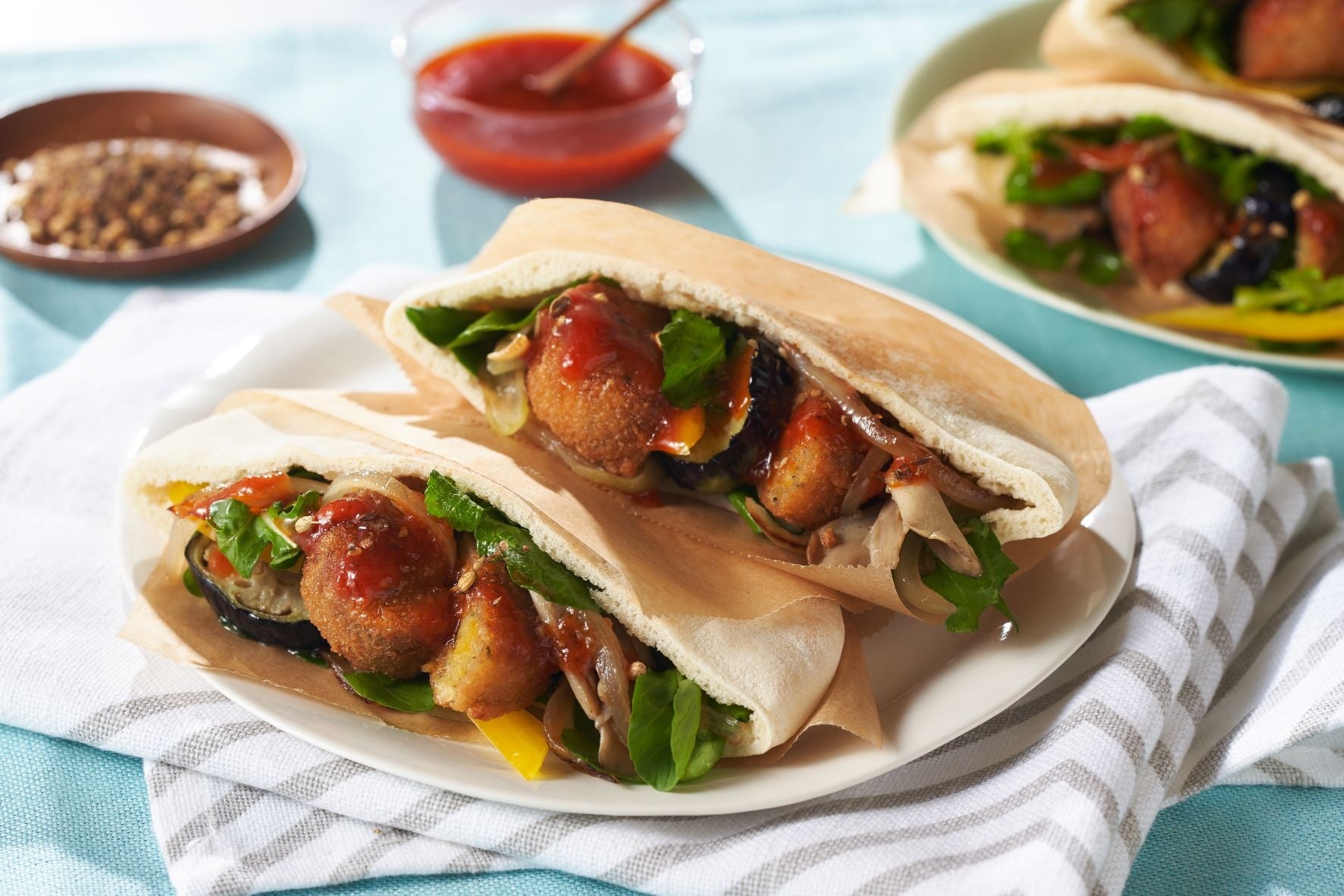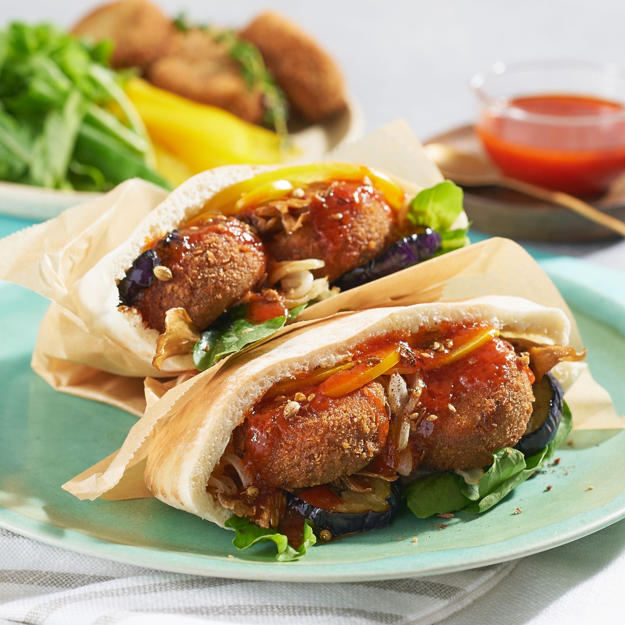 商品説明:ファラフェルとはひよこ豆で作ったコロッケのこと。ピタパンにたっぷりの野菜と共に挟んでいただく、食べ応え充分なプレートです。