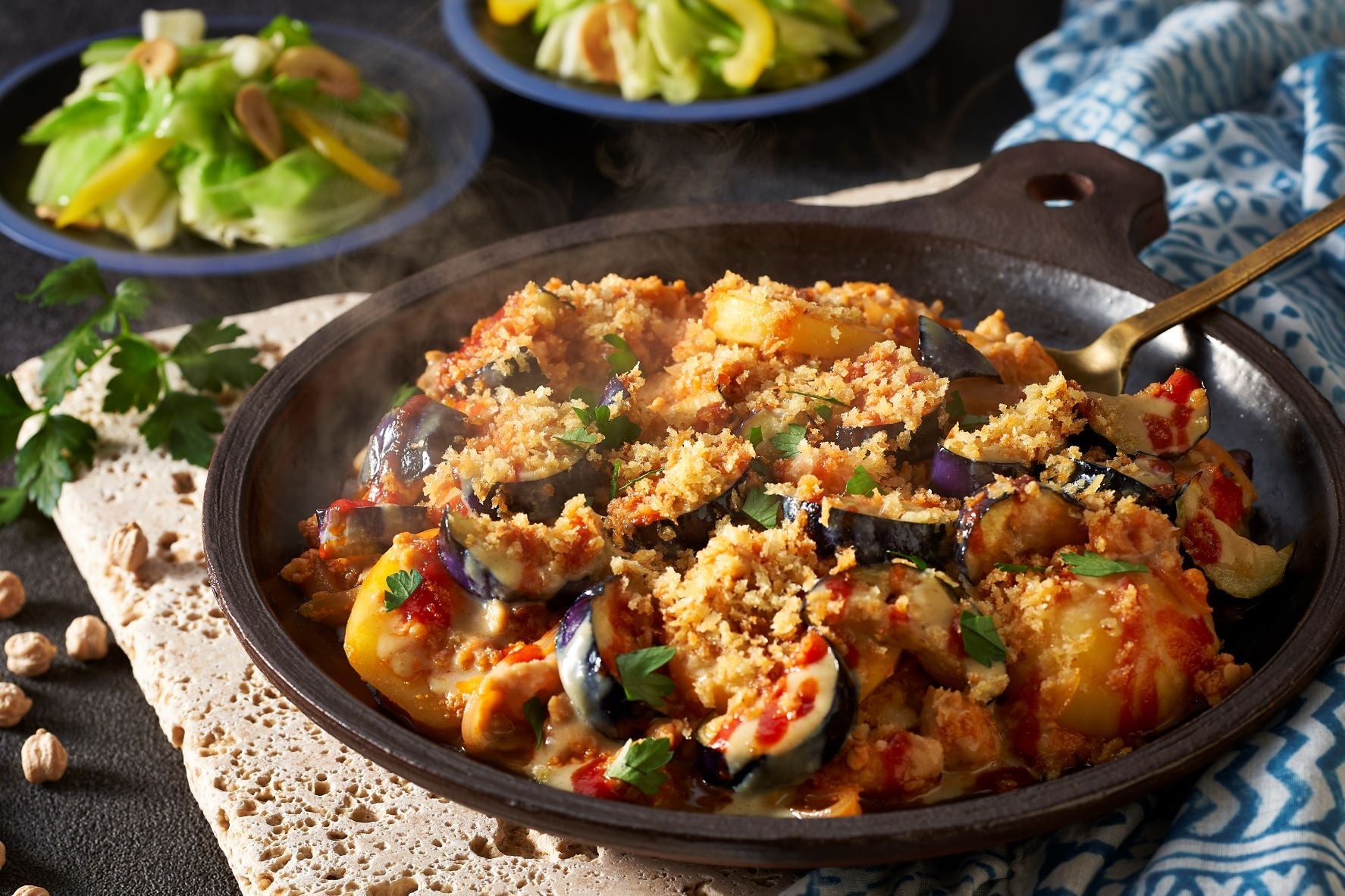 商品説明:ジューシーな茄子とフムスの食欲そそる味付けで、チーズ不使用ながら満足感の高いグラタンをメインにしたデリプレートです。